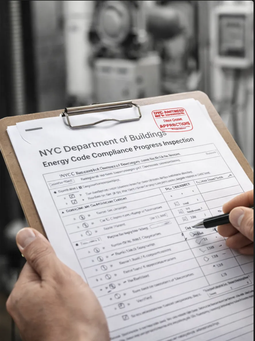 Documents required progress inspections and final certification related to NYC Energy Code requirements.